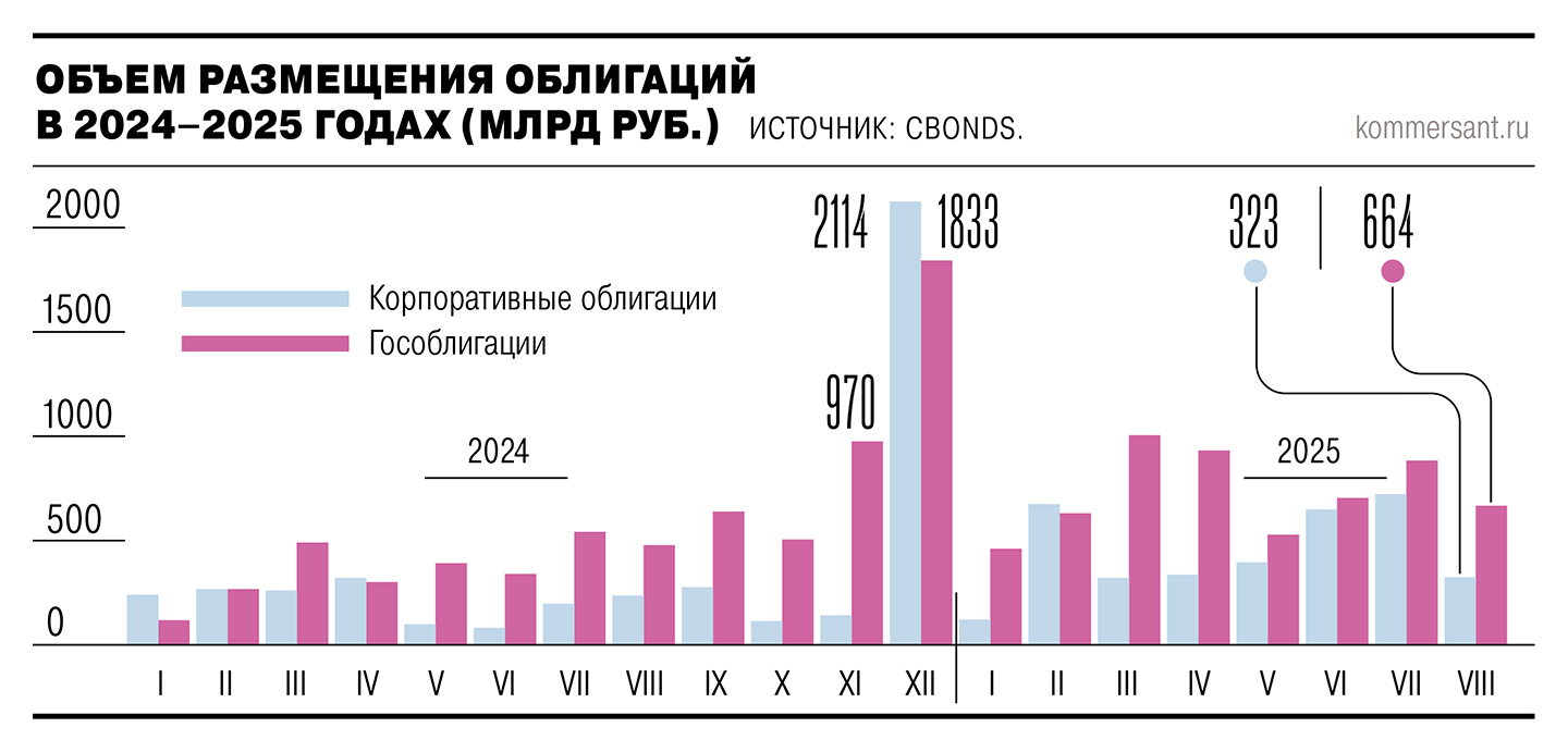 В августе 2025 года корпоративные заемщики привлекли на рынке облигаций почти 664 млрд руб., следует из данных агентства Cbonds. Последний месяц лета традиционно проигрывает предшествующему июлю (в этом году на 25%), однако его результат почти на 40% превзошел показатель годовой давности. Более того, был обновлен исторический рекорд по размещению облигаций в этом месяце. Предыдущий максимум был установлен в 2023 году (552,8 млрд руб.). Как отмечает главный аналитик долговых рынков БК «Регион» Александр Ермак, в отчетном периоде завершились размещения, которые начинались еще в предшествующие месяцы (в том числе и в 2024 году),— 38 выпусков на сумму более 40 млрд руб.