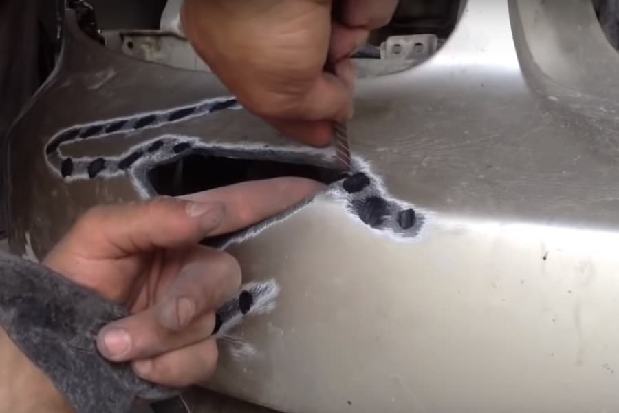 Если на бампері есть трещины или сколы, их необходимо закрепить. Для этого трещины зачищаются с внутренней стороны и склеиваются двухкомпонентным пластикивм клеем или специальным герметиком. После фиксации и высыхания — поверхность шлифуется до ровной.