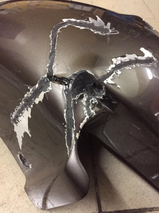 Если на бампері есть трещины или сколы, их необходимо закрепить. Для этого трещины зачищаются с внутренней стороны и склеиваются двухкомпонентным пластикивм клеем или специальным герметиком. После фиксации и высыхания — поверхность шлифуется до ровной.
