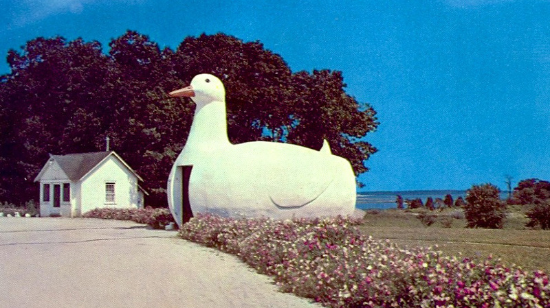 Здание «Большая утка» на Лонг-Айленде, построенное в 1931 году, было смоделировано как реклама в форме гигантской утки для продажи яиц. Но его форма вдохновила зарождающееся движение. Будучи придорожным памятником, оно имело широкое влияние, разрушая представления о том, на что могут быть похожи здания помимо домов и башен.